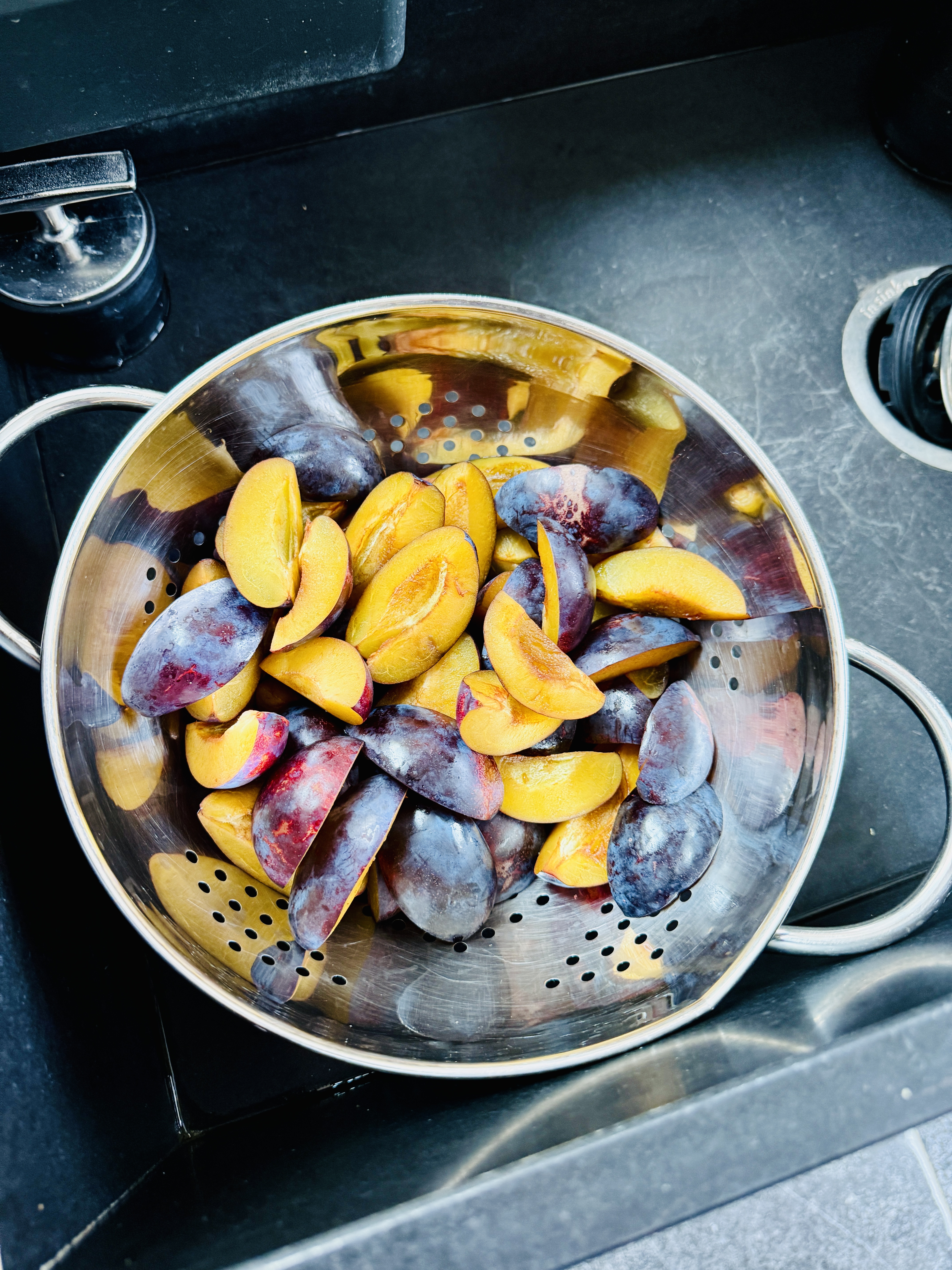 Was de pruimen, halveer deze en onpit de kernen. Snij de halve pruimen nog een keer in 2 - 3 plakken, afhangelijk hoe groot de pruimen zijn.