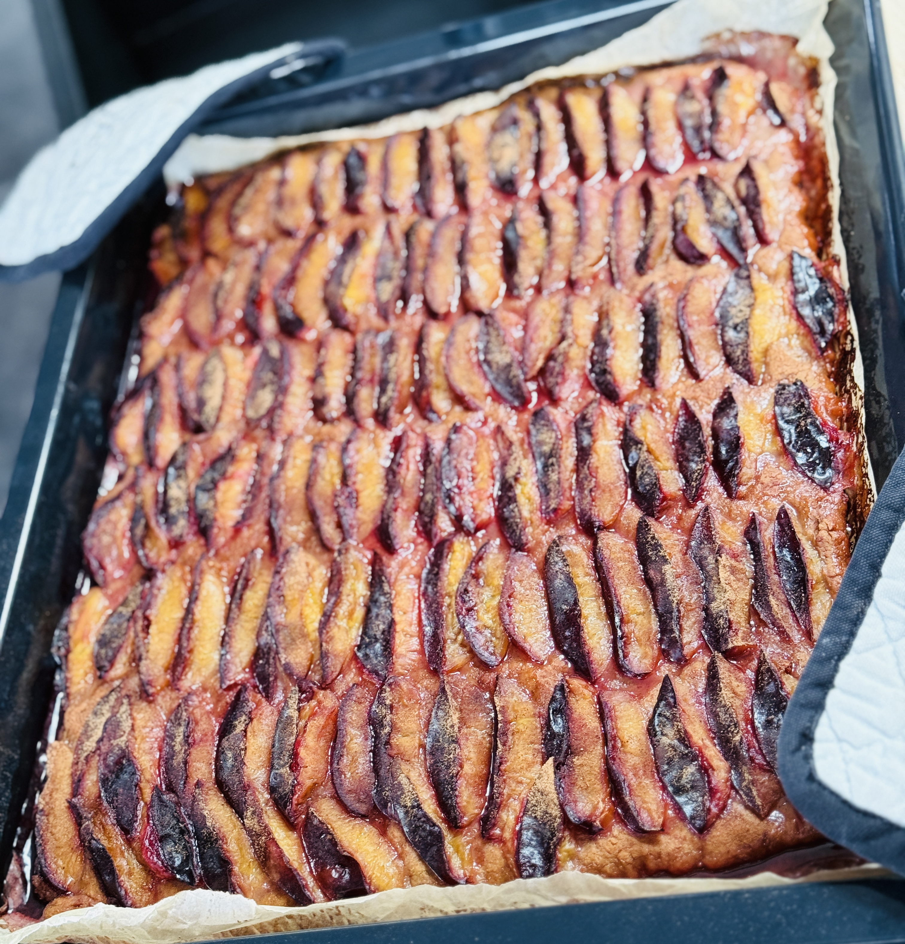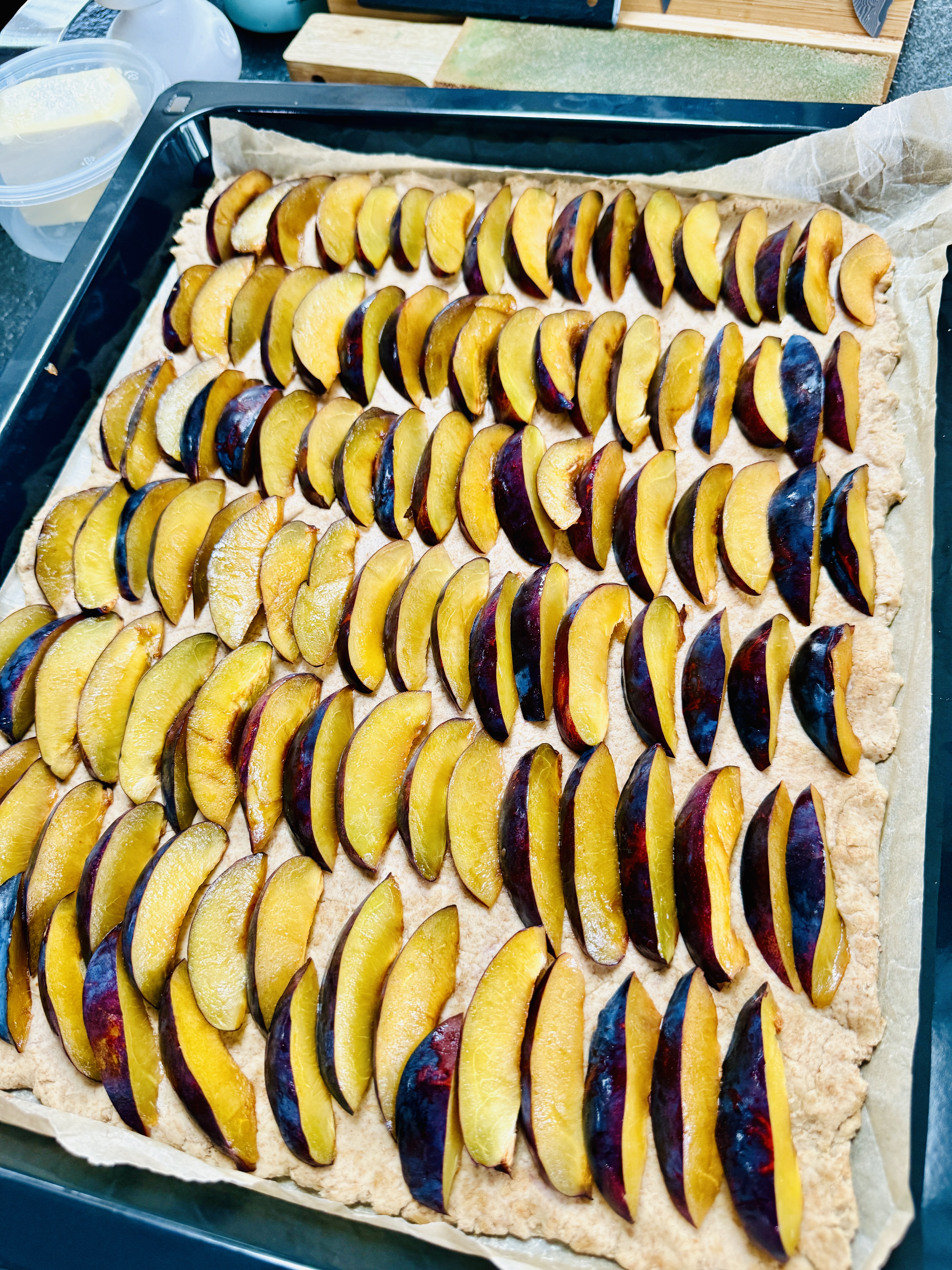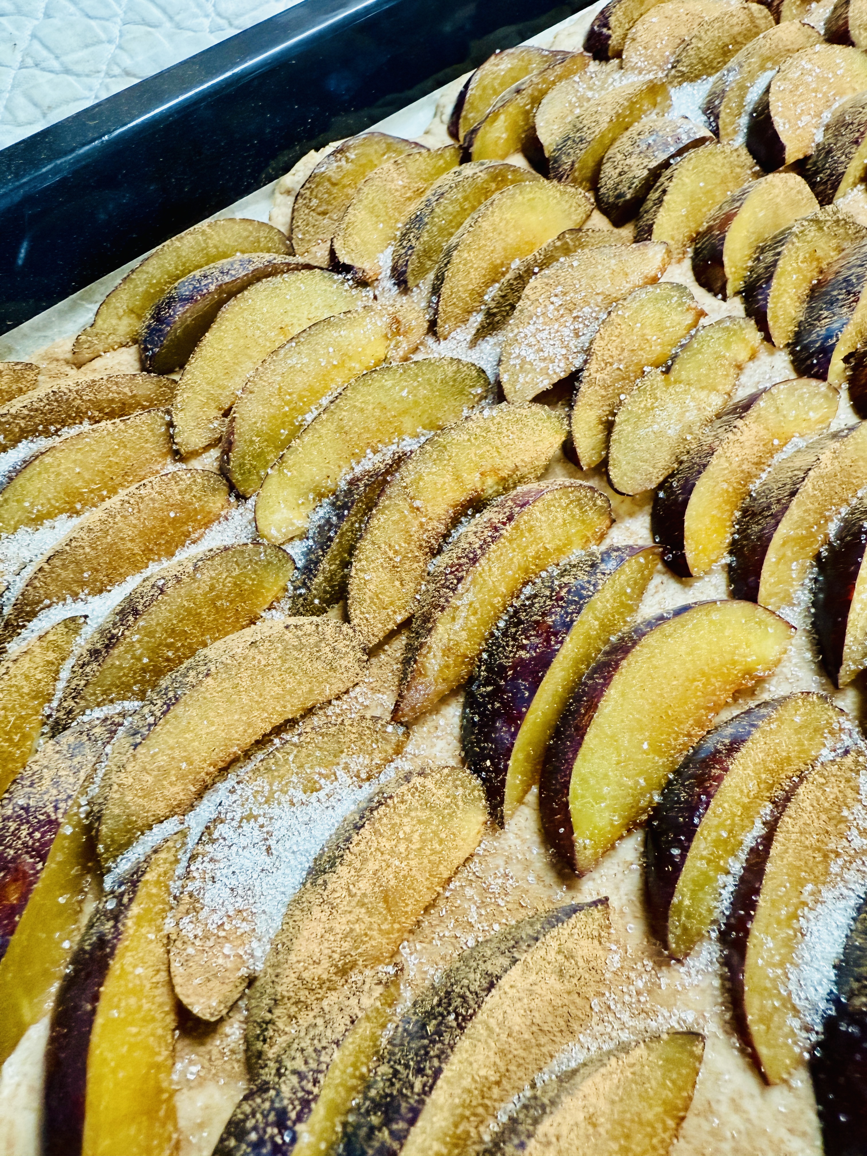 Als de rust tijd over is, kan je nu de deeg op de bakblik uitrollen, zodat de deeg overall de zelfde dikte heeft. Leg nu de pruimen plakken dicht op elkaar. Als alles deeg met de pruimen belegt is, strooi er eerst de kaneel en dan de suiker over de pruimen.